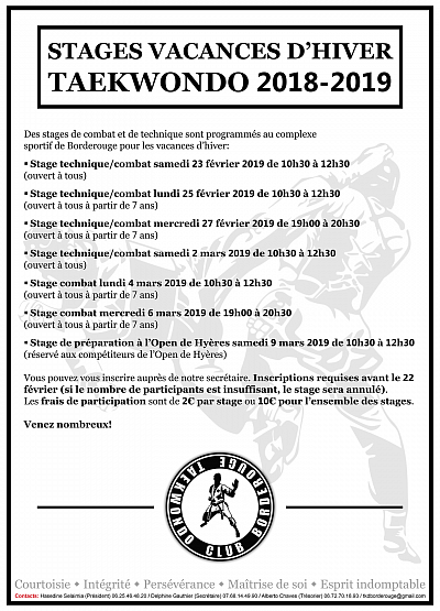 Ces stages seront l'occasion d'approfondir l'apprentissage du taekwondo et de préparer une équipe de compétiteurs pour l'Open de Hyères du dimanche 10 mars 2019 (plus d'informations au sujet de cette compétition dans un prochain mail).